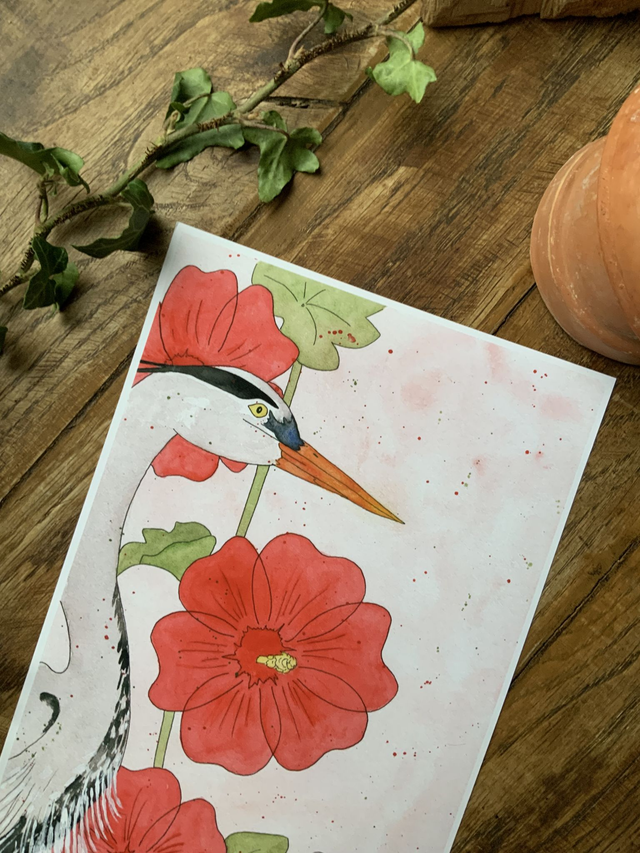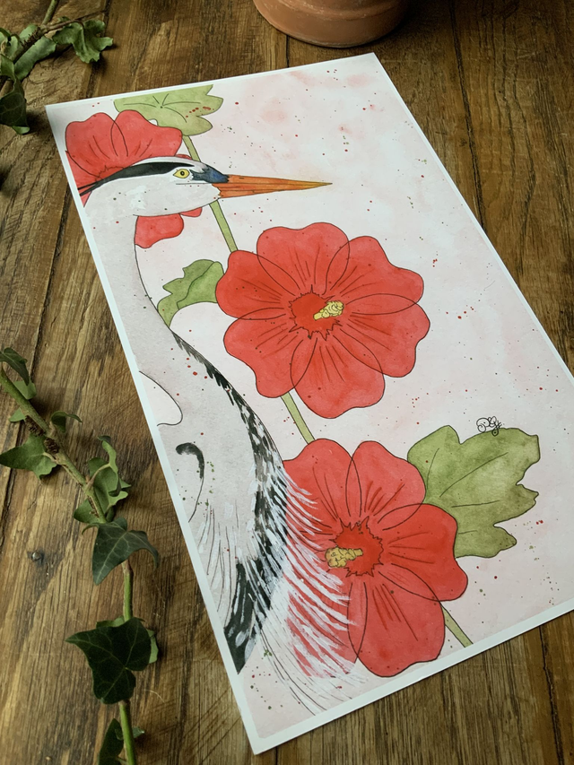 Dessinée par et pour les amoureux de la nature , cette illustration est une reproduction au format 18x29,7 cm de mon aquarelle originale « Héron et ses roses trémières » que vous pourrez retrouver dans la catégorie « Mes originaux ».