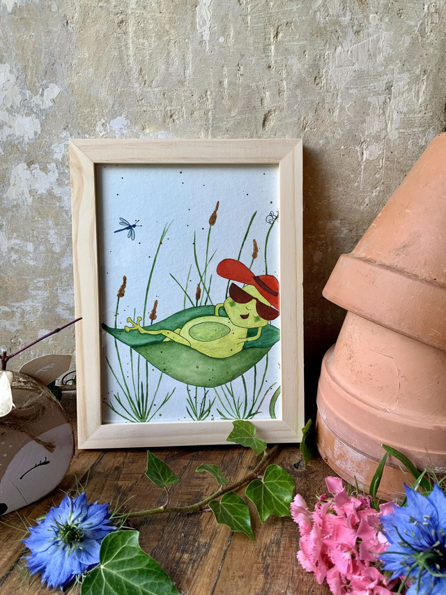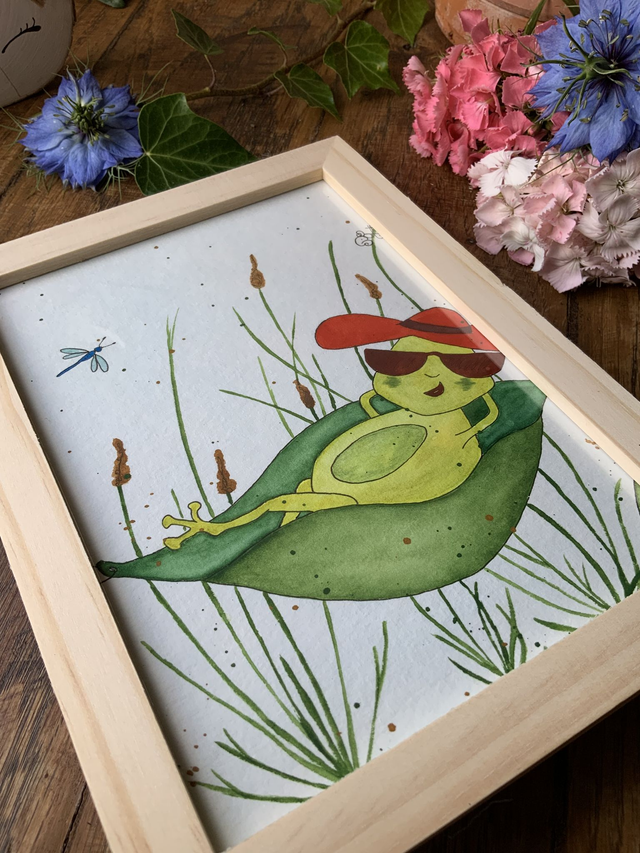 Illustration à l’aquarelle issue de la nouvelle collection « Les Binocles ». Pour les amoureux des rivières et de sa faune, Josée la grenouille vous rappellera qu’il est temps d’aller vous la couler douce auprès de la rivière que vous aimez tant ! N’oubliez pas vos lunettes de soleil ! Illustration à poser ou à accrocher.